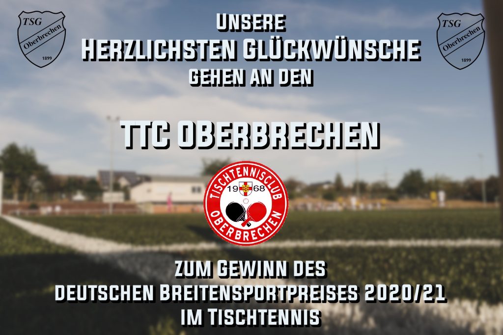 „Lieber TTC Oberbrechen, die TSG Oberbrechen gratuliert recht herzlich zum „Deutschen Breitensportpreis 2020/21 im Tischtennis“. Gute Arbeit wird belohnt.Es ist immer wichtig, dass es Menschen gibt, die mit Herz und Verstand,sei es als Sportler oder Funktionär, Ihrem Hobby nachgehen. Ohne das große Engagement von Personen, ohne das „Kümmern“ kannman einen solchen Erfolg nicht verbuchen. Sportliche …