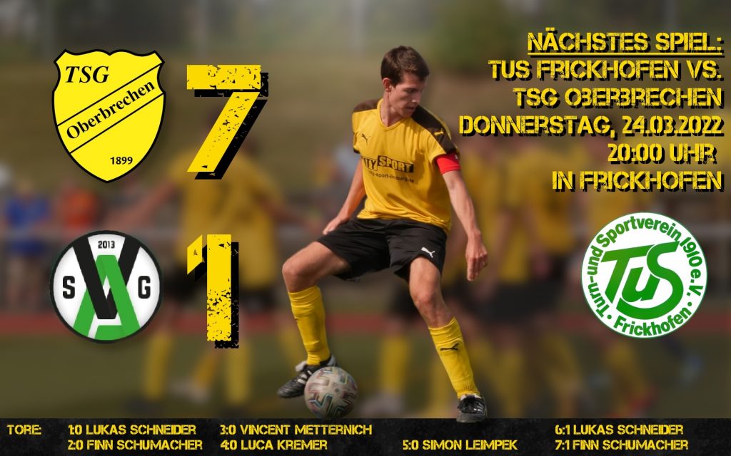 TSG OBERBRECHEN – SG WINKELS/PROBBACH/DILLHAUSEN 3:0 (2:0) Endlich geht es wieder um Punkte! Trotz einer durchwachsenen Vorbereitung war die Vorfreude auf das Restprogramm bei der TSG groß, was sich in den ersten Minuten widerspiegelte. Pascal Schmitt nahm sich einem Freistoß aus knapp 20 Metern an und verwandelte diesen traumhaft über die Mauer hinweg im Kasten …