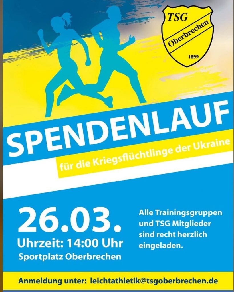 Am kommenden Samstag, den 26. März 2022, findet unter Leitung der Leichtathletikabteilung ab 14:00 Uhr auf dem Oberbrecher Sportgelände ein Spendenlauf für die Kriesgflüchtlinge der Ukraine statt 🔵🟡⚫ Es wird eine Runde von ca. 300 Metern auf dem Sportplatz abgemessen, die in einer vorgegeben Zeit von 30 Minuten möglichst oft gelaufen werden soll. 🏟️ Die …
