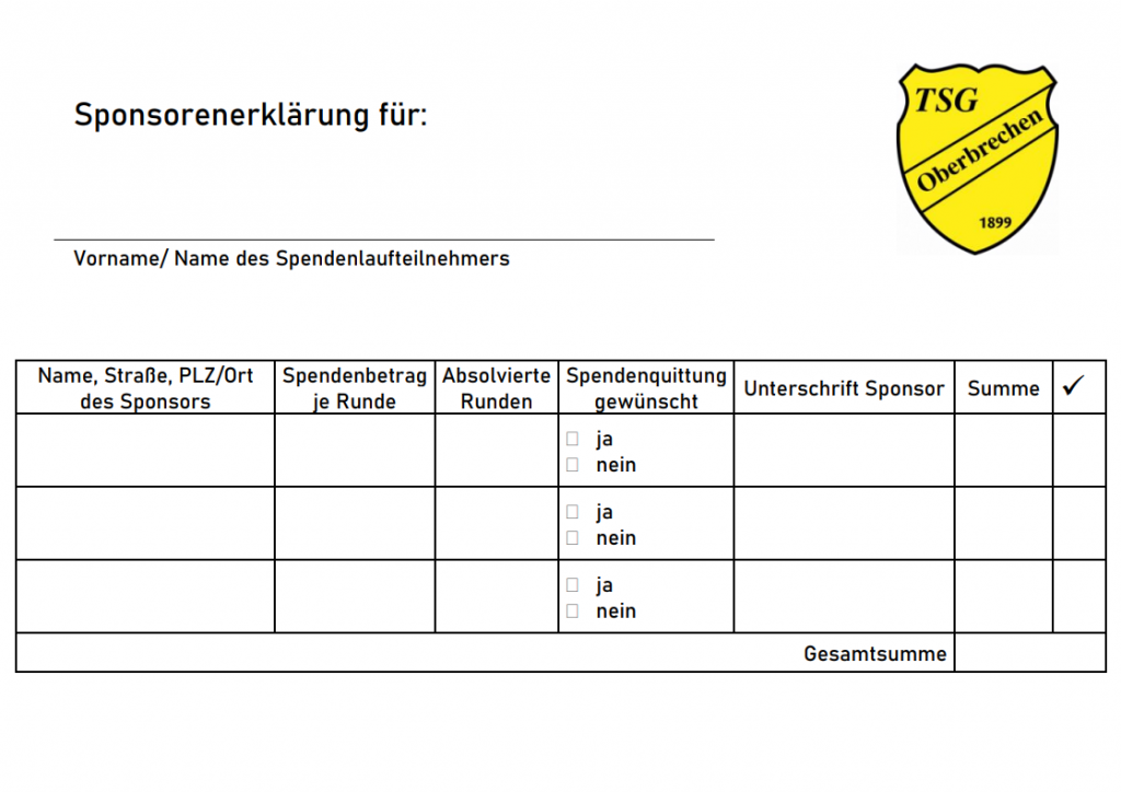 Liebe Mitglieder*innen, sofern ihr am kommenden Samstag, den 26.03. um 14:00 Uhr, am Spendenlauf der Leichtathletik-Abteilung der TSG Oberbrechen teilnehmen möchtet, bitten wir euch, das beigefügte Formular auszudrucken und bereits ausgefüllt zum Lauf mitzubringen. Vielen Dank! Wir freuen uns auf Euch! Sponsorenerklärung