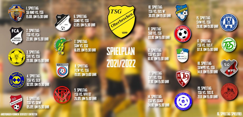 Die neue Saison bei den Seniorenfußballern steht vor der Tür und der Spielplan für die Spielrunde steht ebenfalls fest! Hier findet ihr alle Spiele der 1. Mannschaft sowie der Heimbel auf einen Blick. Die Fußballer der TSG Oberbrechen freuen sich auf die neue Saison und eure zahlreiche Unterstützung! Herren, Kreisoberliga, Kreis Limburg-Weilburg Datum Uhrzeit Spieltag …