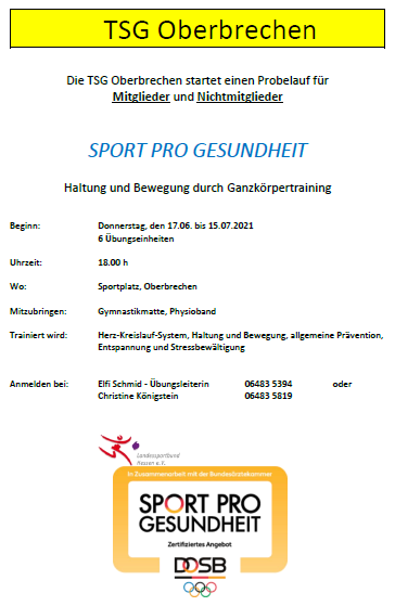 Wie so vielen anderen Vereinen ist es auch der TSG Oberbrechen und seinen aktiven Sportlern derzeit nicht möglich, gemeinschaftlich weder im Freien noch in der Halle ihren jeweiligen sportlichen Aktivitäten nachzugehen. Seit einigen Wochen wird deshalb mittwochs in der Zeit von 18:15 bis 19:30 Uhr über das Internet das Rückenfitnesstraining mittels Videoschalte angeboten. Für die …