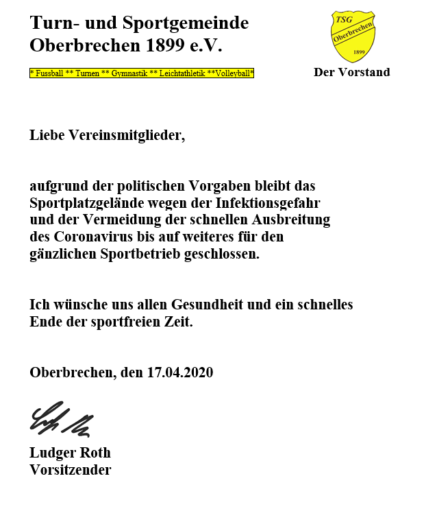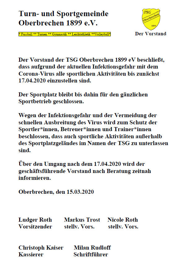 März 2020 Liebe TSG´ler, Vorstandsmitglieder und Übungsleiter, auch wir haben und müssen uns in der „Corona-Krise“ Gedanken über den aktuellen Status machen. In den letzten Tagen hat sich der geschäftsführende Vorstand mit dem Thema auseinandergesetzt. Die meisten Sportverbände haben mittlerweile ihren Spielbetrieb eingestellt, viele Sportveranstaltungen und auch Versammlungen werden abgesagt. Uns ist es wichtig, das …