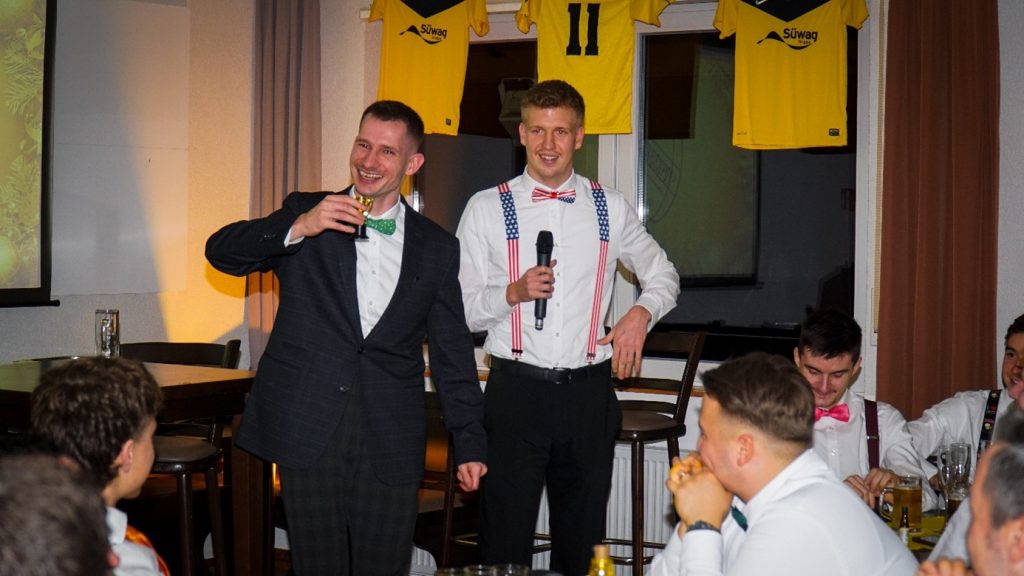 Eröffnet wird die Feier von Vincent Metternich, Nicolas „Kalli“ Gebhardt und Paul Schneider. Die Begrüßung ist ausführlich, voller Rückblicke und Anekdoten – so wie man es von unseren TSG-Trainern kennt.