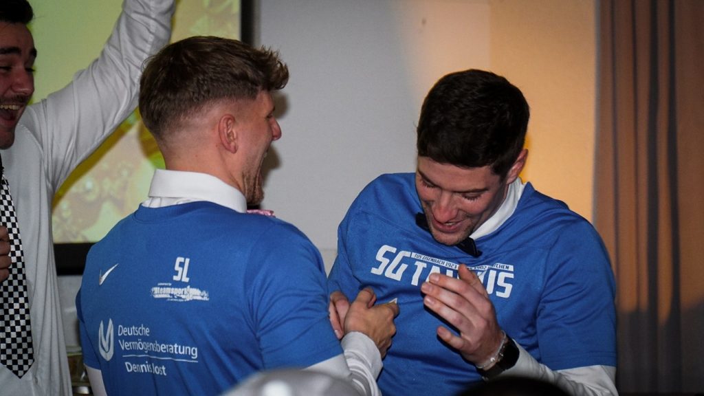 Simon Leimpek hatte keinen festen Partner und durfte sich bei jedem Partnerspiel einen aus der Menge aussuchen – so erwischte es Antoine Grund und Viktor Martin, der am Abend gleich mehrfach mit freudiger Botschaft auf die Vertragsverlängerung von Cheftrainer Viktor Iterman um ein weiteres Jahr verwies. Simon trug während der Spiele das Shirt der SG Taunus, sammelte in einem Jahr wertvolle Erfahrung bei seinem ehemaligen Verein, ist dankbar für diese Zeit – legte das Shirt am Ende der Spiele jedoch endgültig ab und kehrte symbolisch in die Reihen seines Heimat- und Herzensvereins zurück. Mit einer emotionalen Ansprache eroberte er im Sturm die Herzen aller Spieler – sofern er diese nicht schon vorher erobert hatte.
