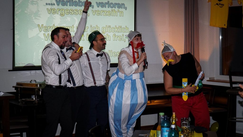 Der dramaturgische Höhepunkt: die Eichung. Ein Mehr-Runden-Marathon, bei dem die Kandidaten interviewt, geprüft und herausgefordert wurden. Spätestens hier wurde allen Neuen klar, dass Ausdauer nicht nur auf dem Platz zählt. Aufgaben wie das Zerplatzen eines Ballons auf dem Schoß des Mitspielers, Pantomime, motivierende Reden halten oder Lieder singen – alles unter Punktwertung und flankiert von reichlich „Strafgetränken“.